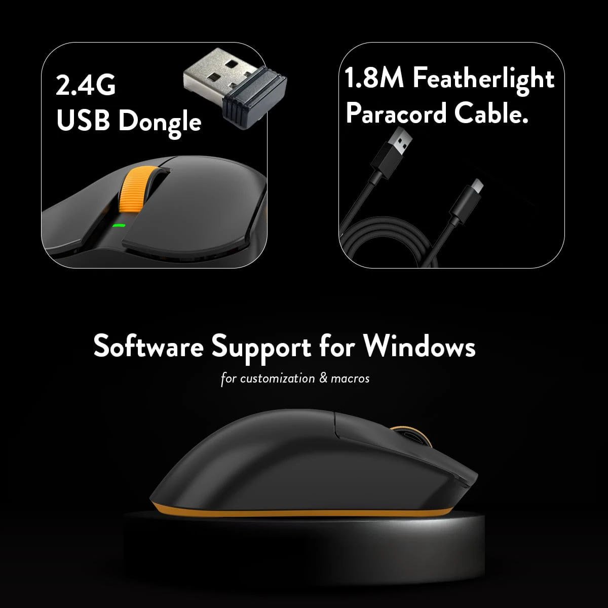 Dotted Mouse Feet x 1U, Extra Battery x 1U, Mouse x 1U, Paracord Cable x 1U, User Manual x 1U, Wireless Dongle x 1U