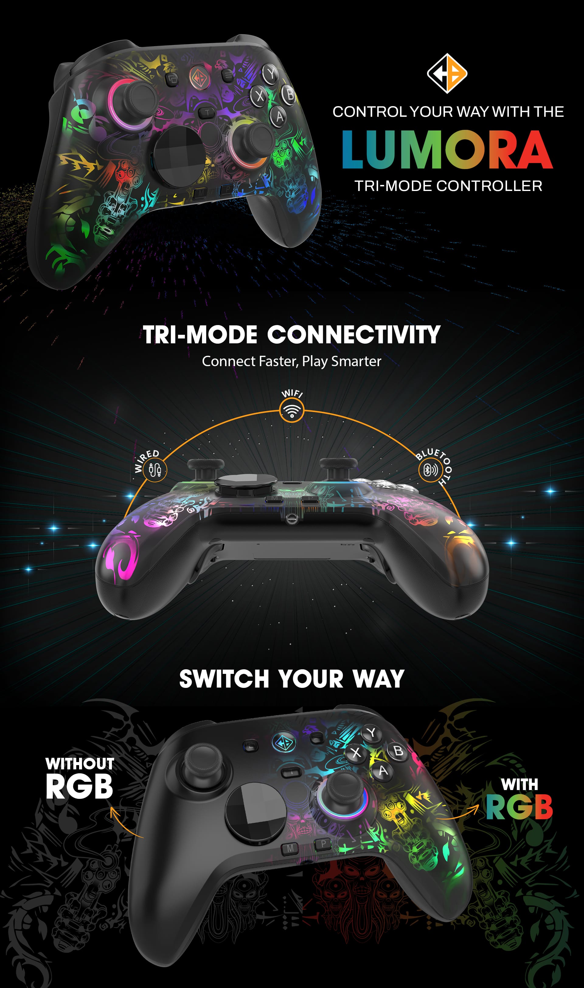 The Lumora is designed primarily for Windows PC (XInput/DInput). It also has limited support for Android, iOS, Smart TVs, and Mac OS via Bluetooth. Note that it is NOT compatible with PlayStation, Xbox, or Nintendo Switch, and no warranty or support is provided for console usage.