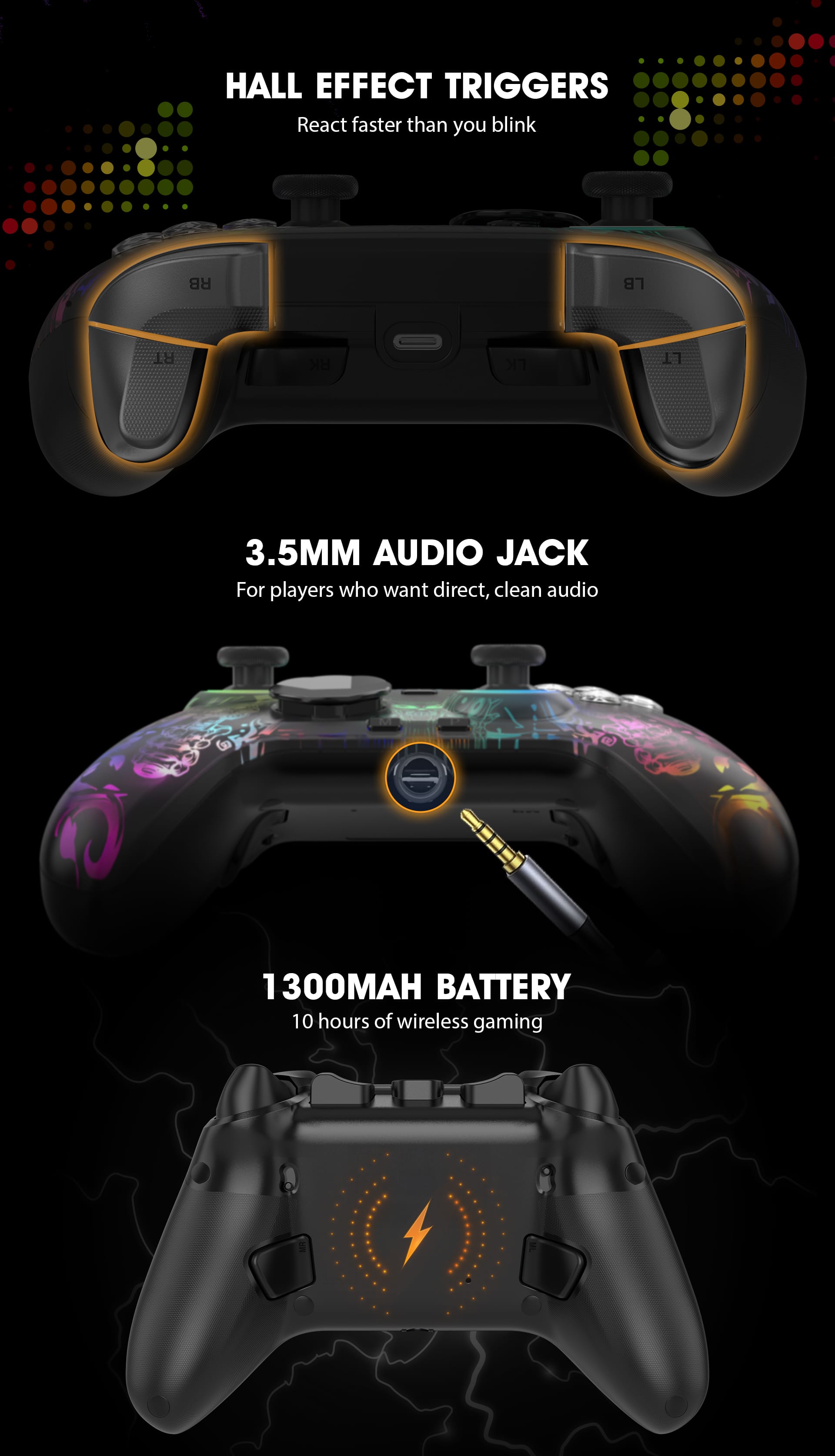 The Lumora has Hall Effect triggers with Analog and Digital modes. In Analog mode, triggers provide gradual linear input. In Digital mode, they act as instant on/off buttons. Press the PAIRING key to cycle through sensitivity levels: 30% → 60% → 100%. The controller vibrates once with each change. Restart the game after switching modes.
